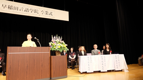 2016年3月1日 新宿区牛込箪笥区民ホールにて、早稲田言語学院 東京校・横浜校の合同卒業式を行いました。東京校は中山春樹学院長から、横浜校は鈴木麻美子学院長から、卒業生一人一人に卒業証書を授与し、優秀卒業生が表彰されました。続いて、林麗芳理事長からの祝辞、同済大学卒の唐心怡さんは在校生を代表して送辞を、早稲田大学に見事合格した梁澤涵さんは卒業生を代表し答辞を述べました。2年間お世話になった担当教員からの一言の後、「さくら」の大合唱と共に幕を下ろしました。卒業生の皆さん、早稲田言語学院で学んだこと、日本に留学へ来た当初の気持ちを忘れずに、4月からの新生活を頑張ってください。これからの皆さんの活躍を楽しみにしています。