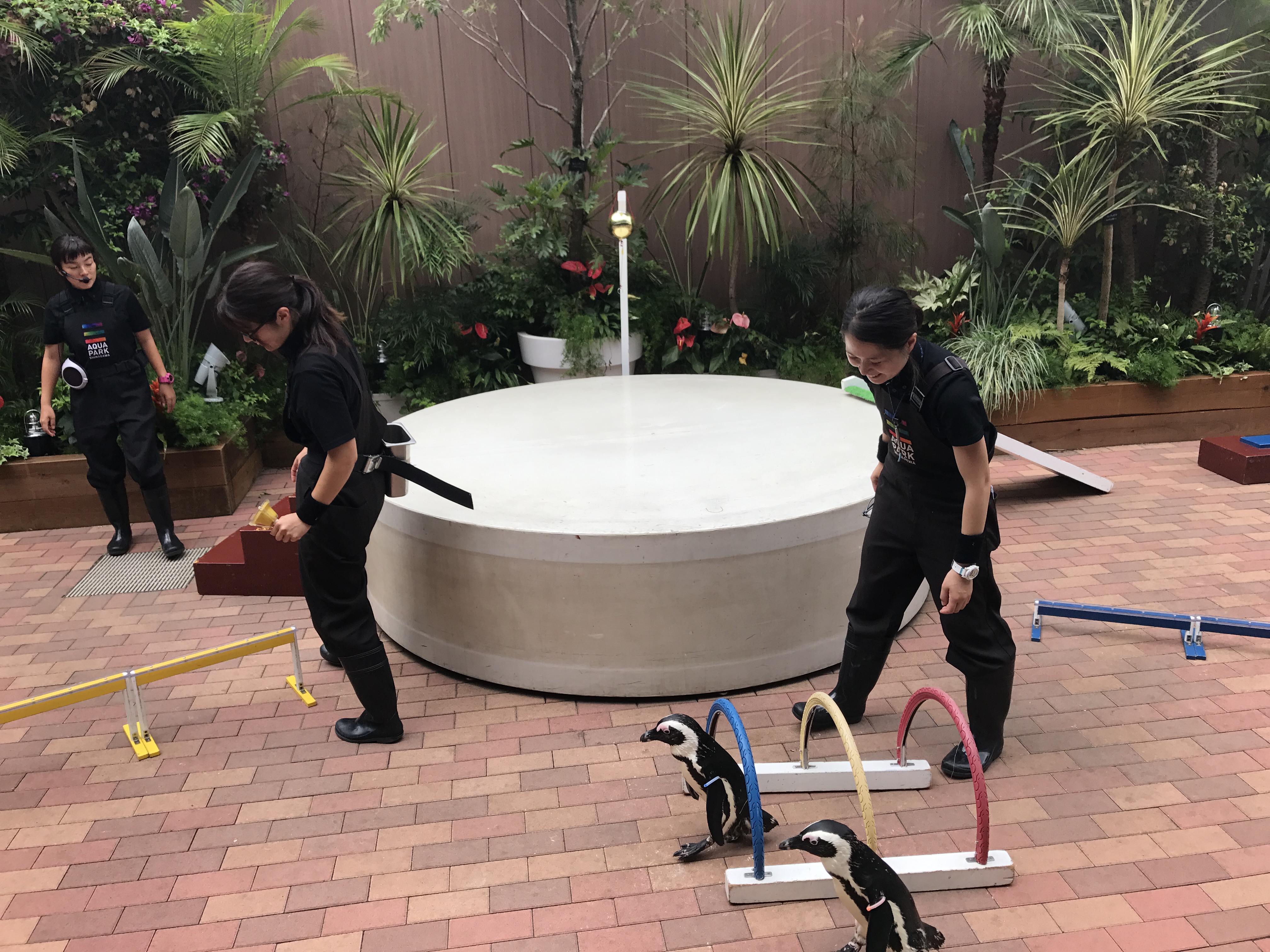 また、広場では「ペンギンの運動会」が開催され、暑い中ペンギン君たちが頑張って障害物競走に参加してくれ、みんなで応援しました! 最後にスペシャルイベント「イルカショー」レインコートを着て、濡れることを覚悟して最前列で鑑賞です!大迫力のイルカの演技にみんな大興奮!感動です!