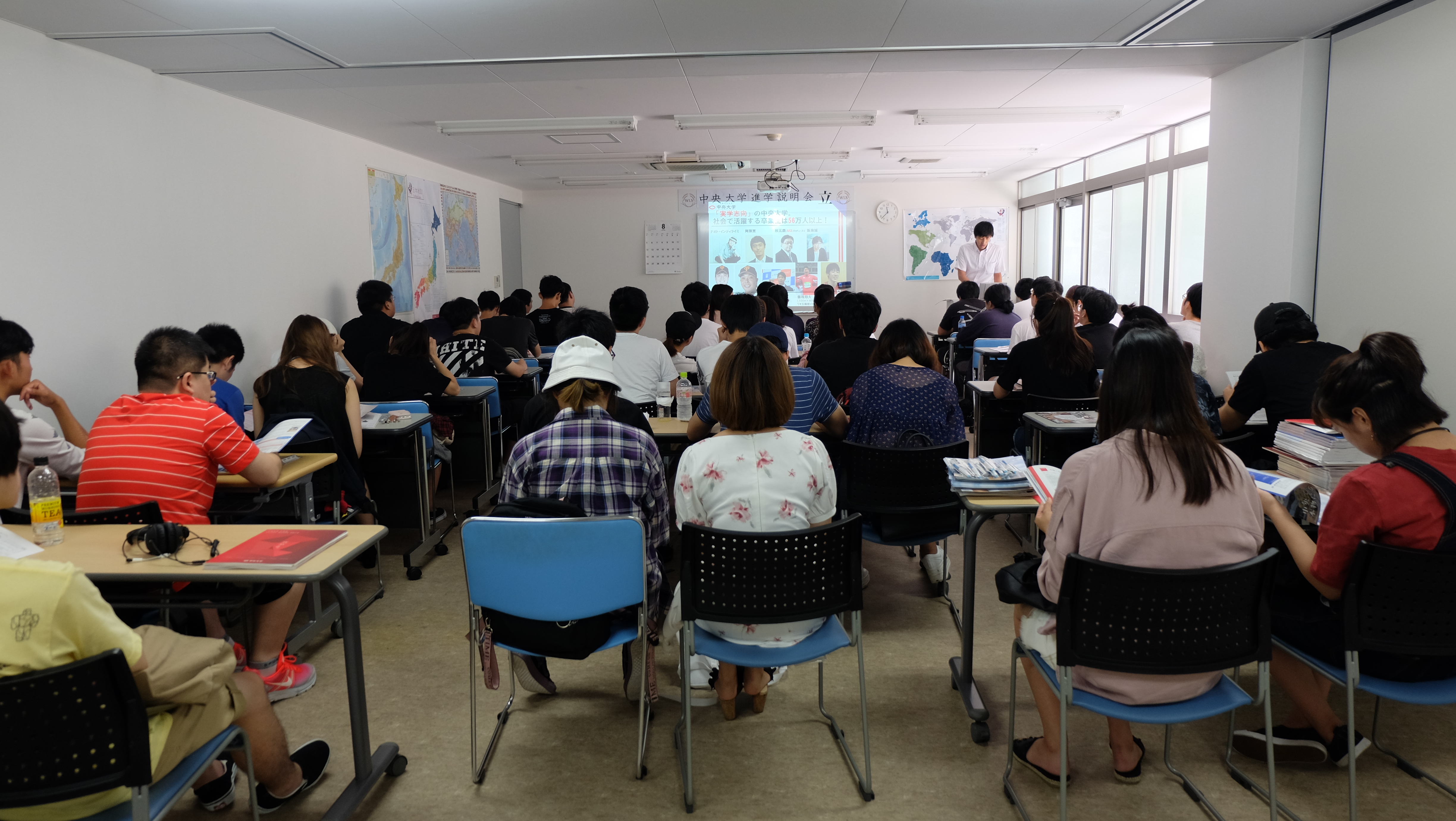 8月22日、早稲田言語学院内で中央大学の進学説明会が行われ、入学企画課の荻野大祐さんが大学の概要、入試についてご説明くださいました。「秒速5センチメートル」の新海誠監督やディズニーランド運営会社社長が大学出身者であることに学生たちは沸いていました。