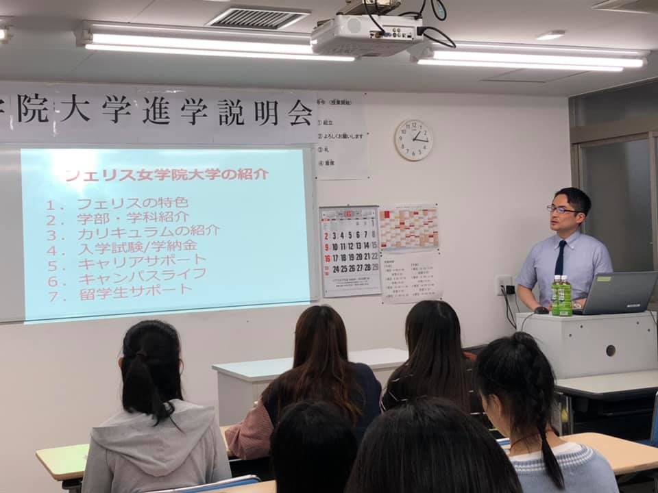 这次说明会近藤教授给学生们介绍了菲利斯的留学生入学考试非常重视面试和小论文,留学生支援制度充实,入学时都会对留学生进行一对一指导,为了让学生更好的理解上课的内容学校还配有帮带学友制度,另外学费大幅度减免制度,和菲利斯非常值得夸耀的高就职率(99.4%)等等都让同学们赞叹不已,这次说明会确实得到了很多非常珍贵的信息。把大学的老师直接请到学院来给大家做说明会,对于学生来说这是一次很难得的机会。