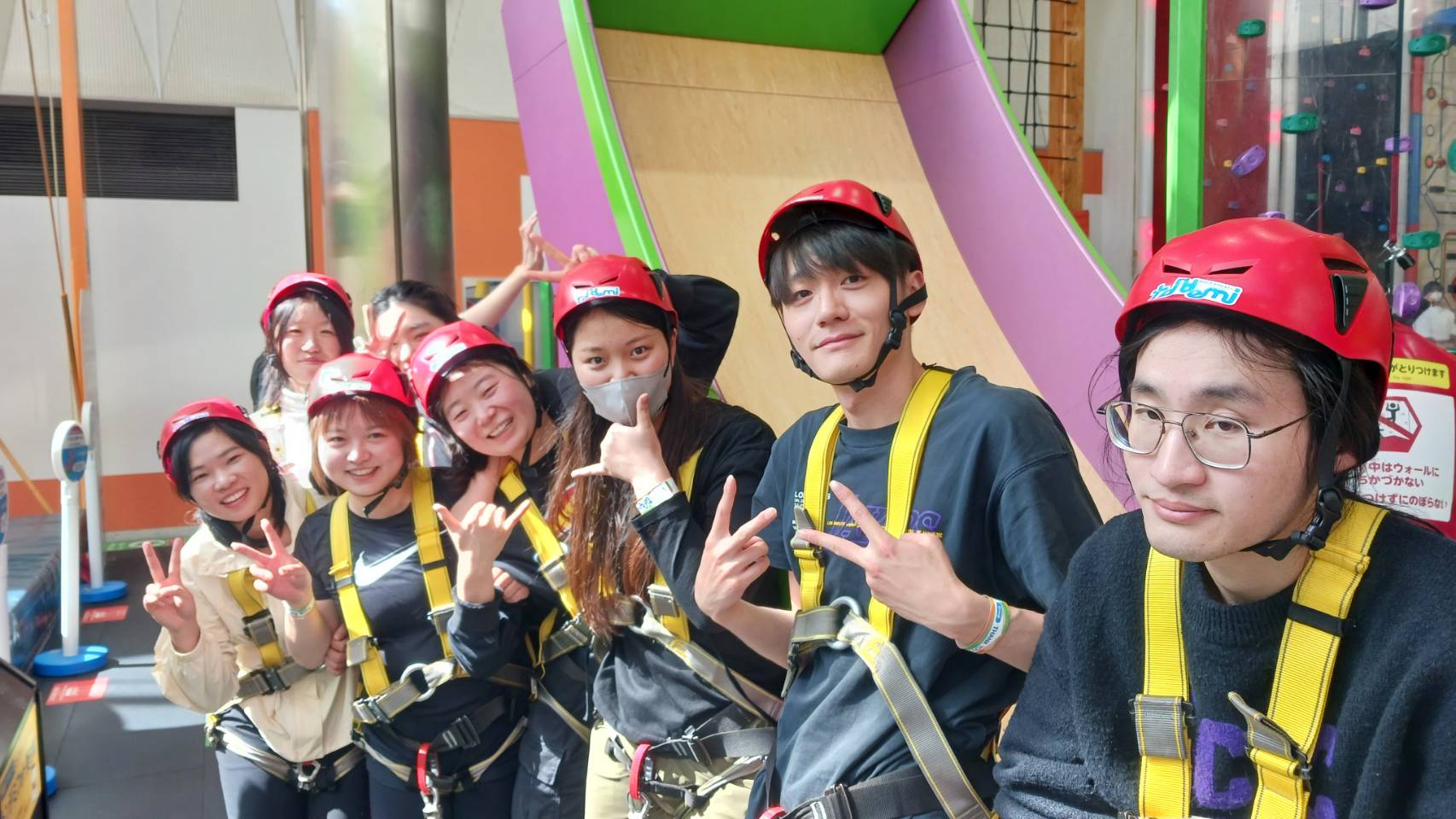 | トランポリンやボルタリングなど体を動かして楽しめるアトラクションが中心の施設で、思い思いにそれぞれのアトラクションに挑んでいました。その中のバランスをとりながら、円柱を登っていくアトラクションでは、普段運動が苦手そうな様子の女子学生たちも、ほぼ全員がチャレンジし、登り切ると、クラメイトや他のお客さんたちから拍手が巻き起こり、得意げな表情を見せていました。 | |||||