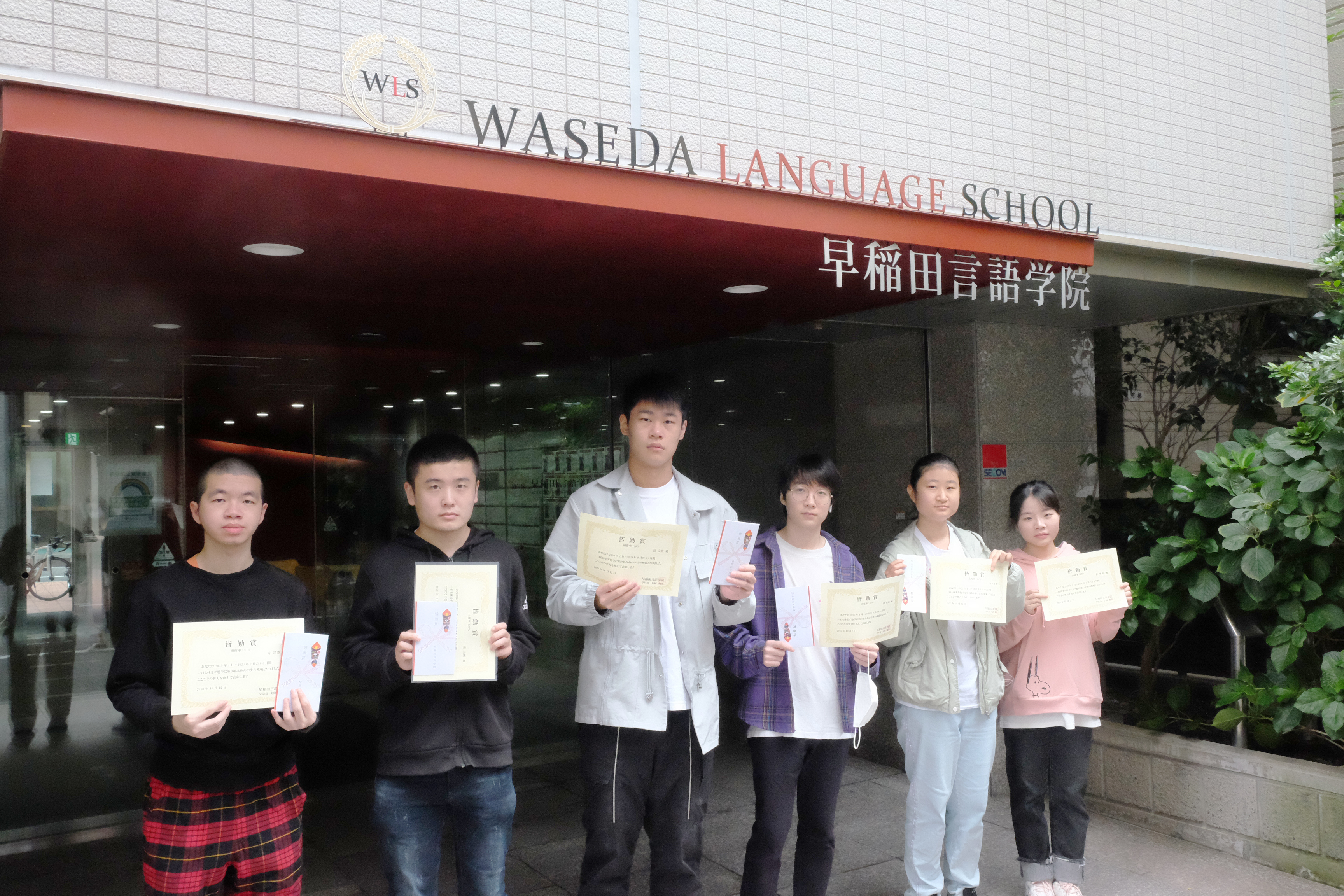| 早稻田言语学院每次都会为获得全勤奖的同学颁布奖状、奖金并拍摄纪念照。 | ||